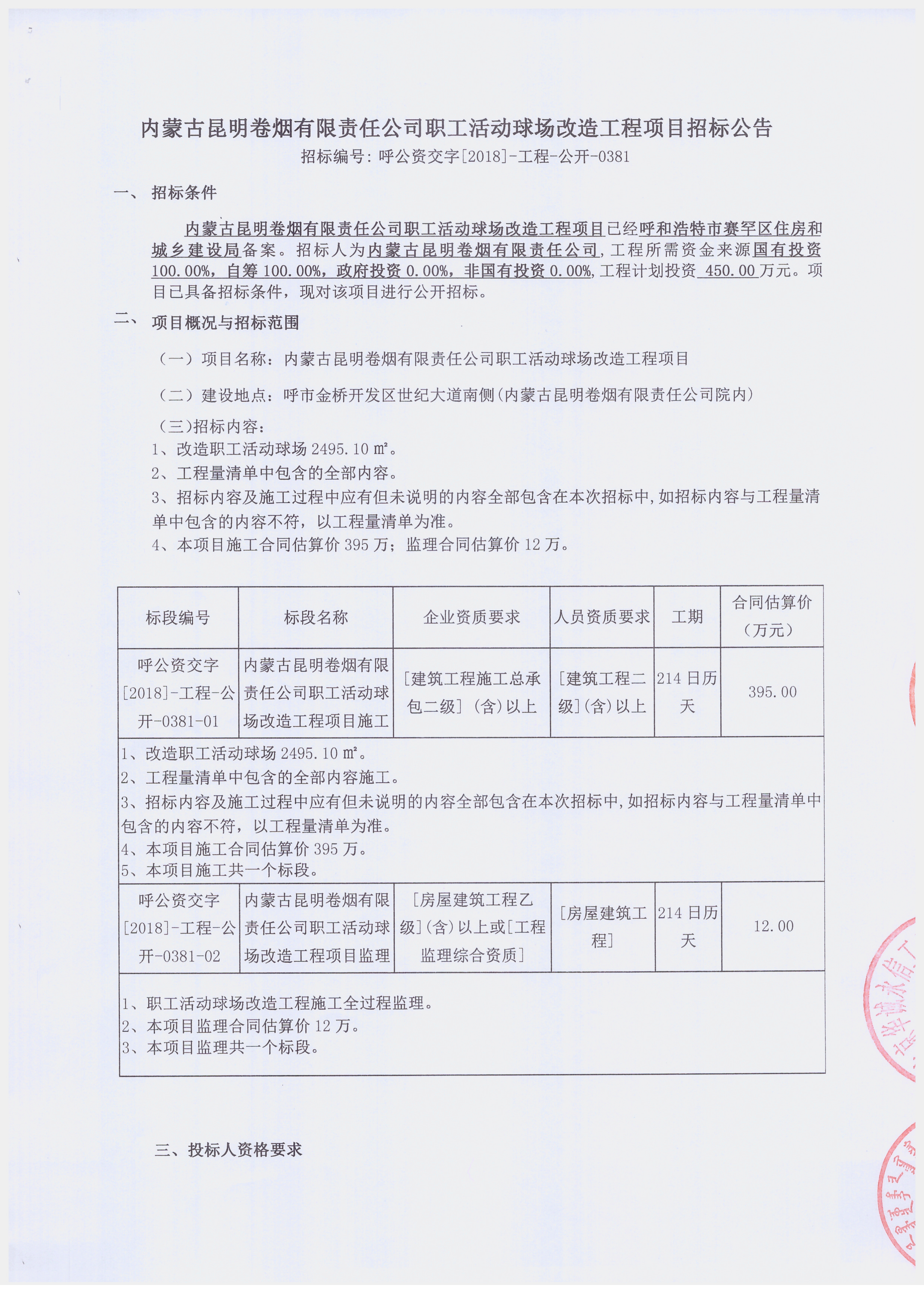 内蒙古昆明卷烟有限责任公司职工活动球场改造工程项目招标公告