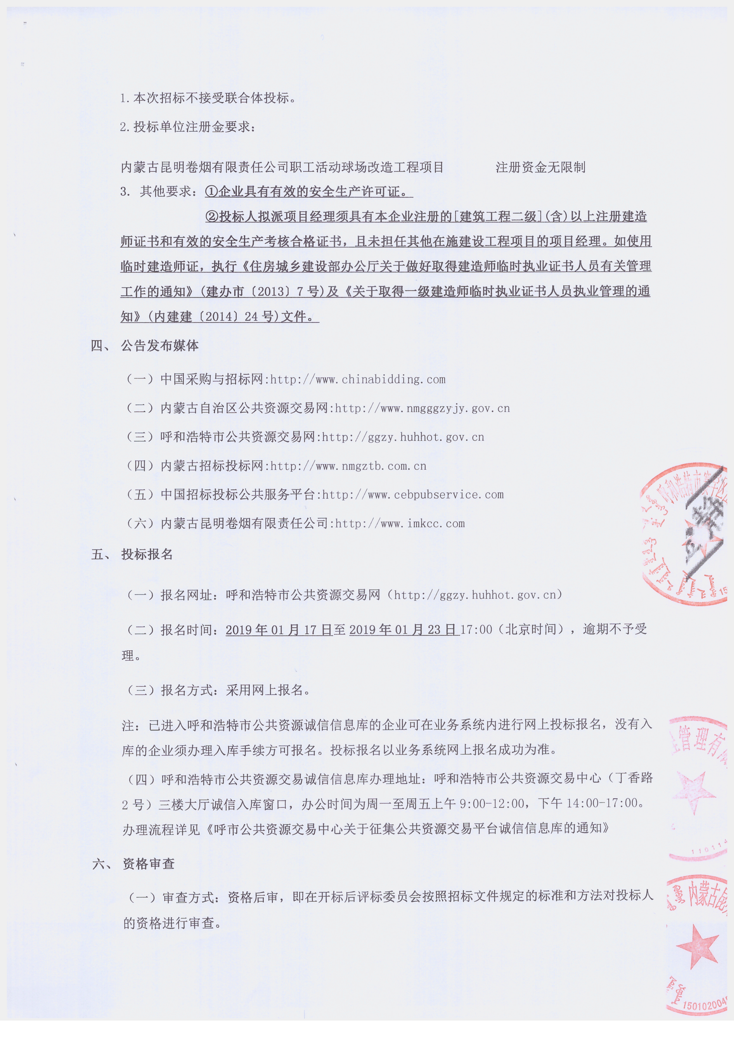 内蒙古昆明卷烟有限责任公司职工活动球场改造工程项目 注册资金无限制