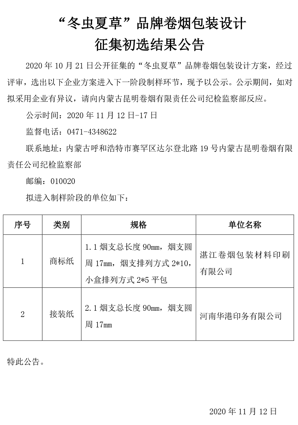 “冬虫夏草”品牌卷烟包装设计征集初选结果公告