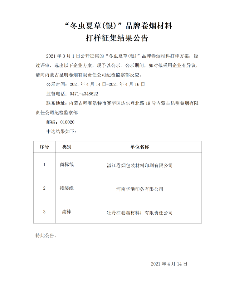 “冬虫夏草(银)”品牌卷烟材料设计打样征集结果公告