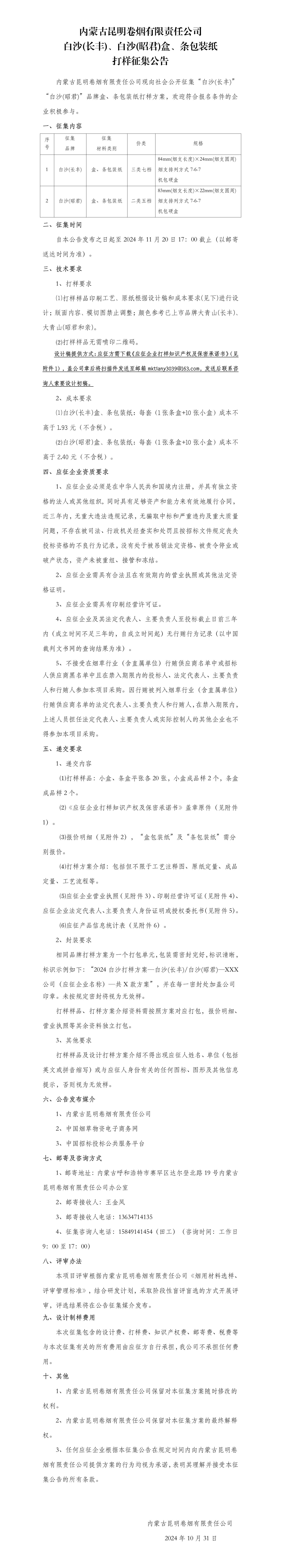 内蒙古昆明卷烟有限责任公司白沙(长丰)、白沙(昭君)盒、条包装纸打样征集公告